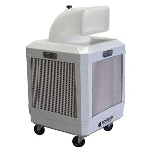 Portable Evaporative Cooler, With Drive, Air Flow 1560/1320 cfm, Cooling Capacity 1000 sq. ft., Blade Dia. 10 In., Drive Type Belt, Speed 2, Motor HP 1/3, Voltage 120, 5.9/5 Amps, Discharge Top Front, Width 25-1/2 In., Depth 25-1/2 In., Height 44-1/2 In., Grille Width 18 In., Grille Height 18 In., Duct Opening Length 8 In., Duct Opening Width 15 In., Media Celdek Chemically Treated Cellulose Pads, Pad Thickness 2 In., Pump Voltage 120, Power Cord Length 9 ft., Water Connection 3/4 In. WAYCOOL Portable Evaporative CoolersHigh-velocity units feature garden hose connection for continuous use, float valve overflow protection, locking casters, and 4 sides of evaporation media. 120V. 5DPX1 is hazardous location rated for Class I Group D. 5DPW8, 5DPW9, and 5DPX2 have oscillating air discharge.Humidify, filter, freshen, and circulate air throughout the year.
